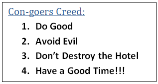 If someone has become too boisterous or needs an escort to a room or taxi, these are the individuals to call. Ops will also respond to any incidents where this code of conduct has been violated. If you cannot find a member of Ops, we encourage you to seek out a member of the Convention staff (wearing convention committee ribbons on their badges), or the panel or hospitality room coordinator. These members will ensure that you are put in touch with Operations promptly.